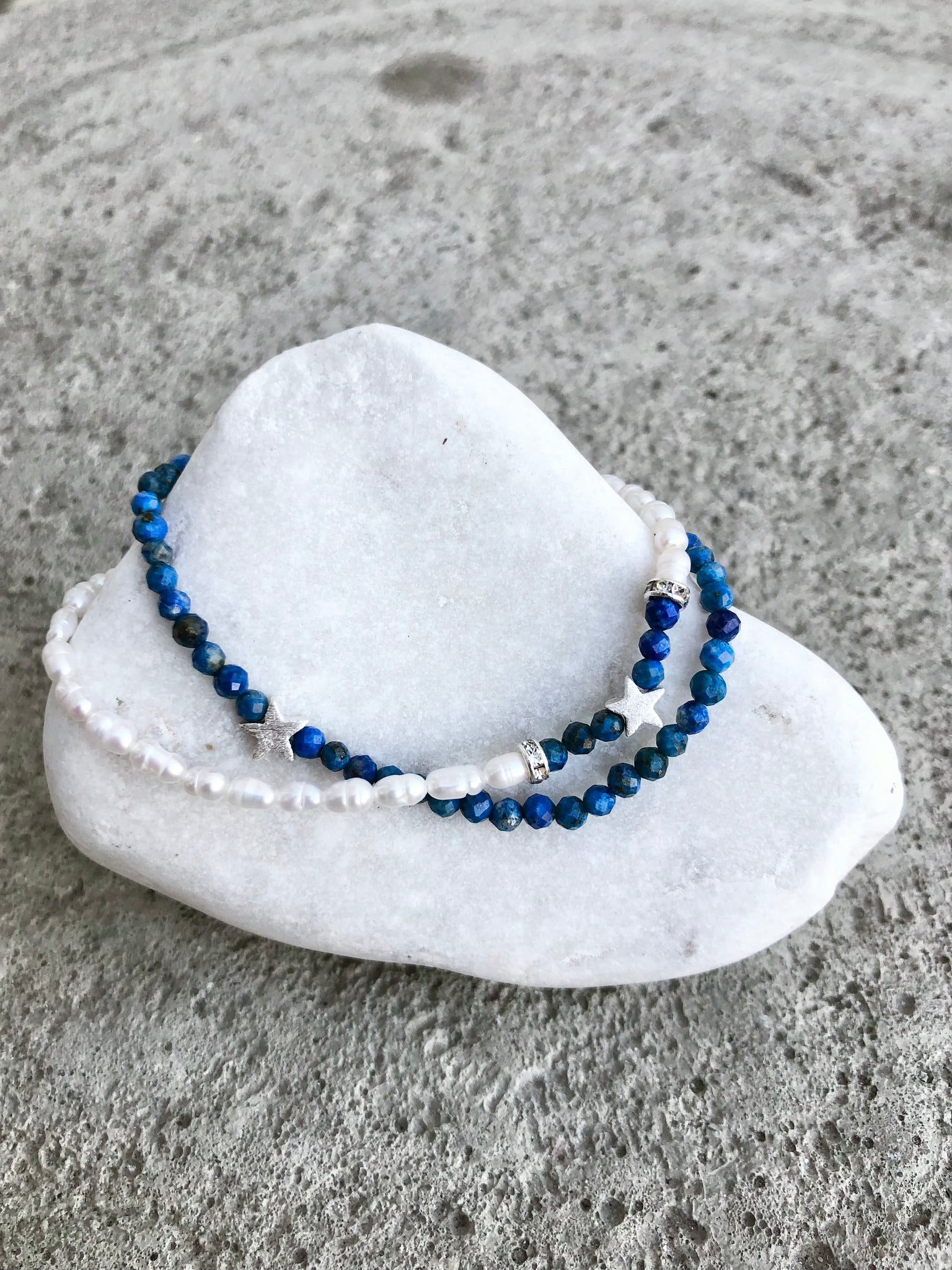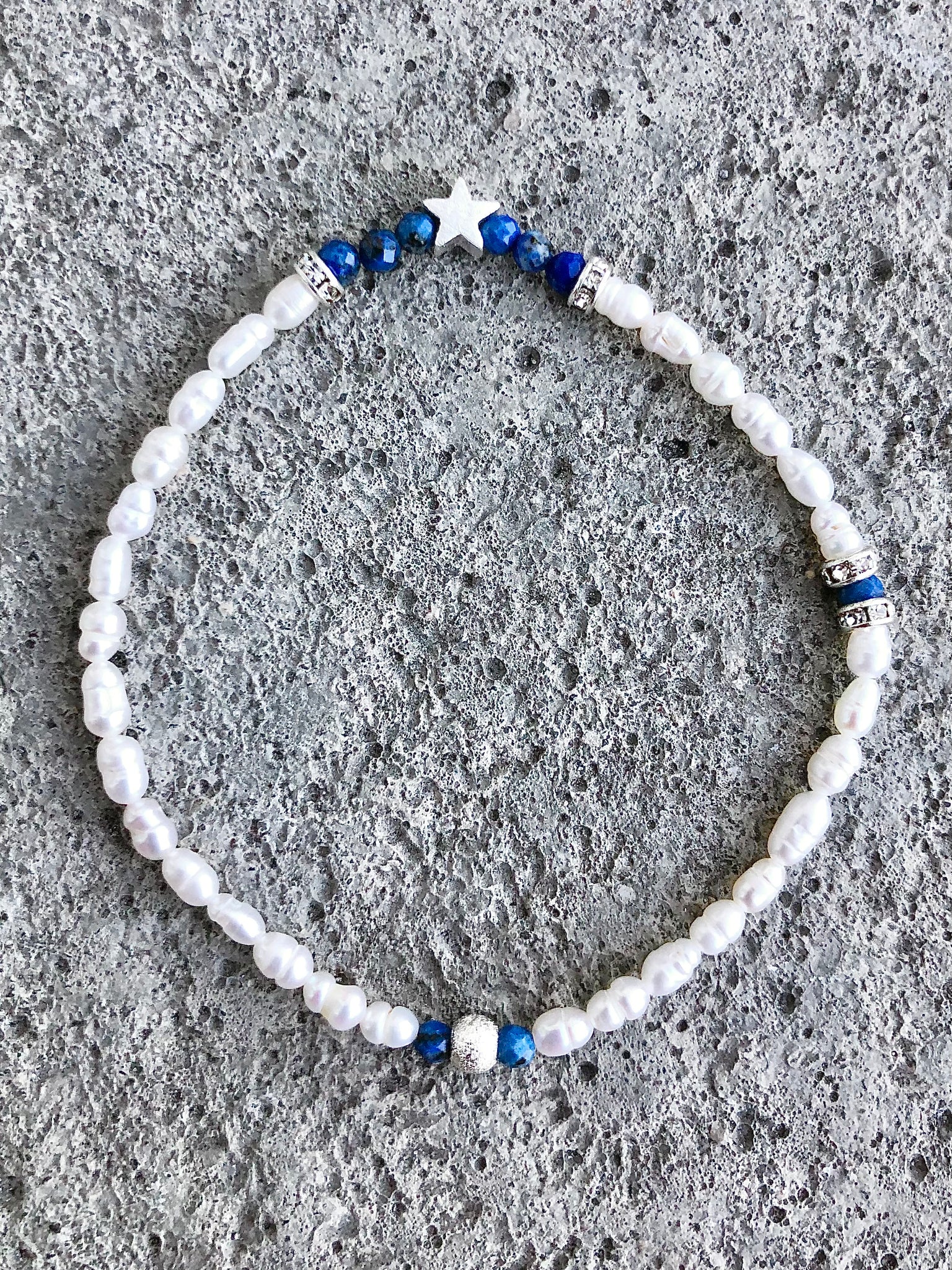 Dieser schöne Armschmuck erstrahlt in Sternenlicht. Die Süßwasserperlen heben das durchdringende Blau des akzentuierenden Lapislazuli hervor.