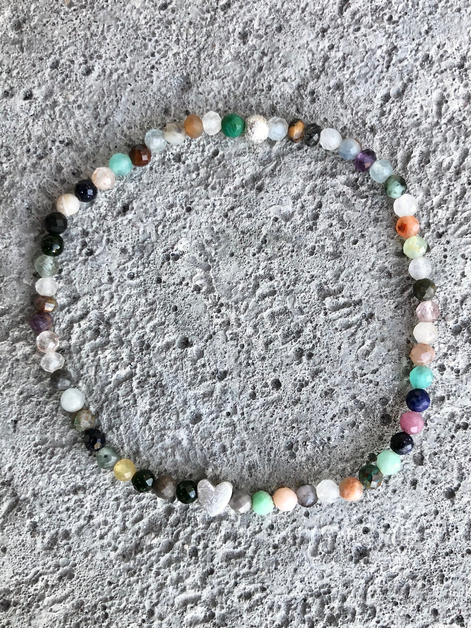 Material: Buntes Armband aus verschiedenen Halbedelsteinen und einem Herz und einer Glitzerkugel aus echtem Silber.