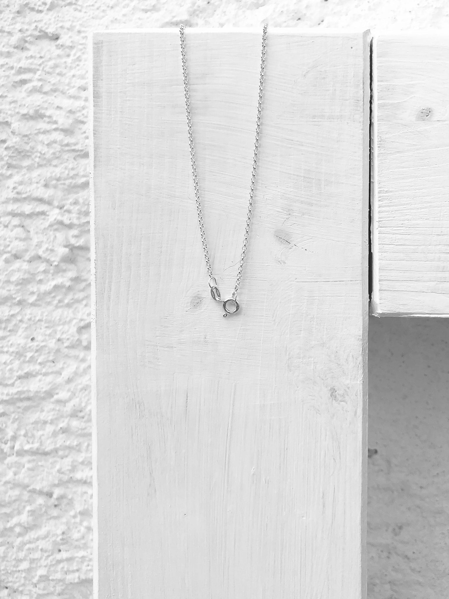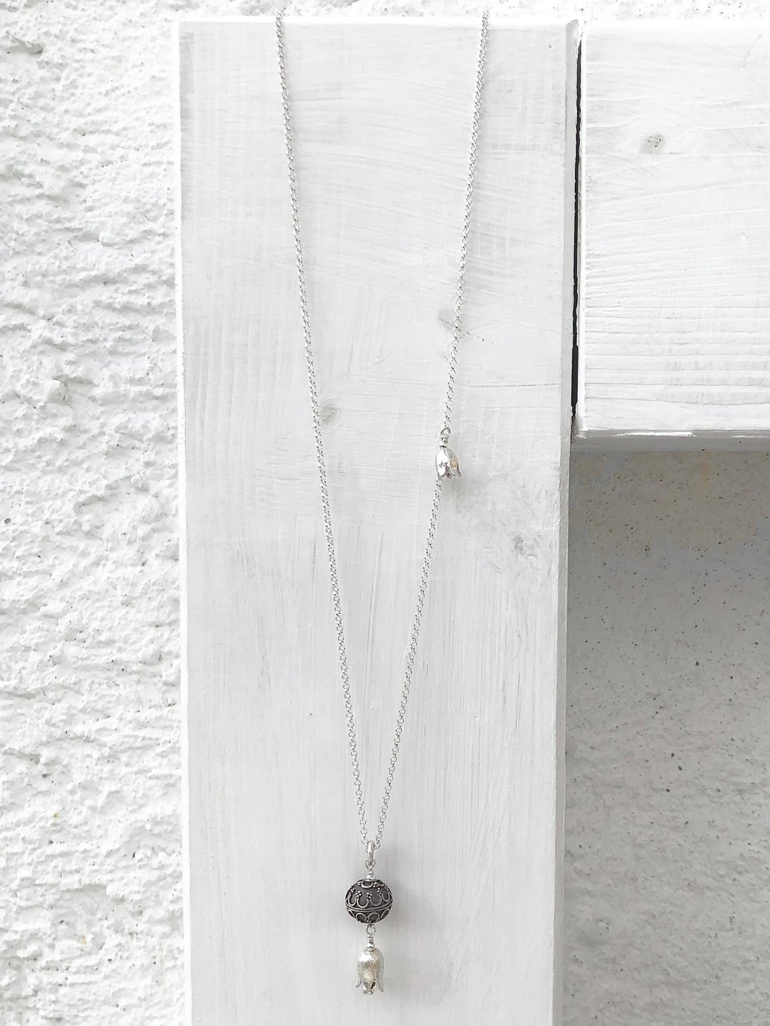 Extra lange Erbskette, daran ein Anhänger mit einer Silbertulpe und ihrer kleinen Schwester.
